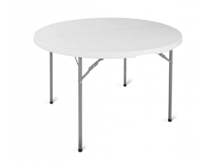Egy masszív, funkcionális és stabil rendezvényasztal. Az asztal teteje rendkívül tartós polietilénből készült. Az asztallap átmérője: 120 cm. Egy speciális összecsukható rendszernek köszönhetően az asztalt egy bőröndbe lehet összehajtani, és az összecsukás maga csak néhány másodpercet vesz igénybe. Ez a funkcionalitás lehetővé teszi az asztal könnyű tárolását és problémamentes szállítását. Az asztal megengedett teherbírása 200 kg! Egy további blokkolás véletlen összecsukódás ellen védelmez, és a lábakat gumipárnákkal rögzítették, hogy megvédjék a felületeket a karcosodástól és az asztalt az elcsúszástól. Az alvázat porfestett acélból készítették.